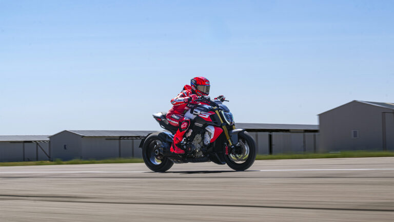 Kjøreegenskapene til Diavel V4 RS balanserer ytelse med komfort: 790 mm sittehøyde gjør den tilgjengelig, og innstillbar demping, cruise-kontroll og full elektronikk gjør lange turer like mulige som dynamiske sprint-økter. En roadster som ikke gir avkall på det riktige signalet.